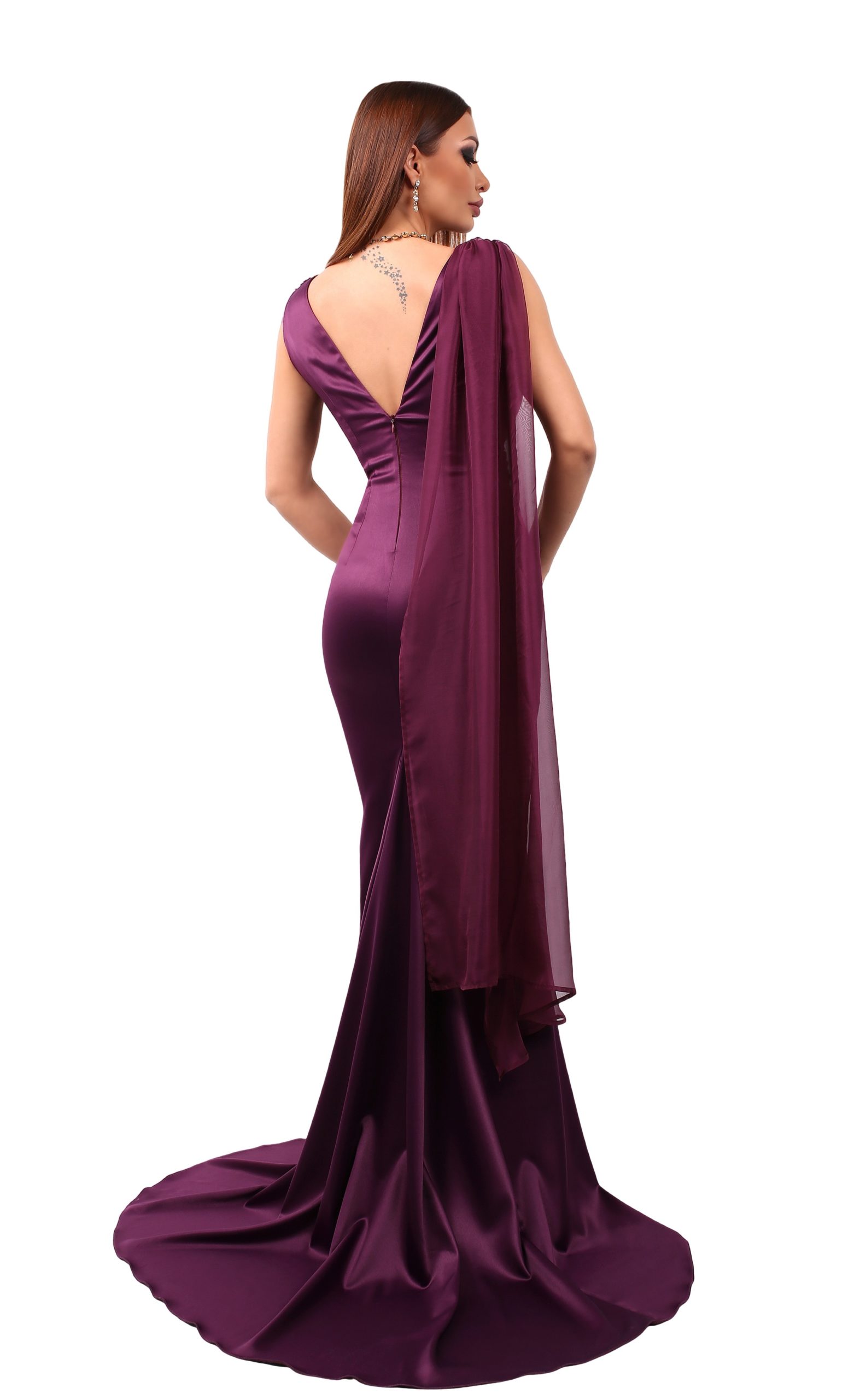 Rochie sirena cu decolteu si esarfa pe un umar,realizata din tafta elastica OSCAR si voal din matase. Bustul este dublat.